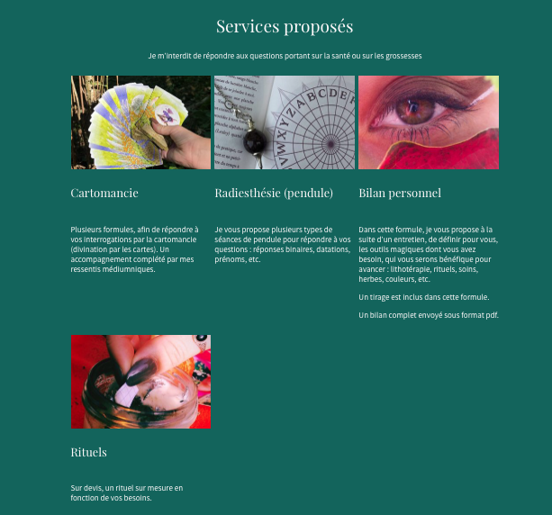 Passionnée depuis toujours par l'univers de l'invisible, j'ai découvert la divination très tôt et m'y suis de suite plongée. Je vous propose de partir avec moi dans ce voyage vers les mondes insoupçonnés de la magie. Sur mon site, plusieurs formules sont disponibles : Cartomancie, radiesthésie, bilan personnels et rituels.